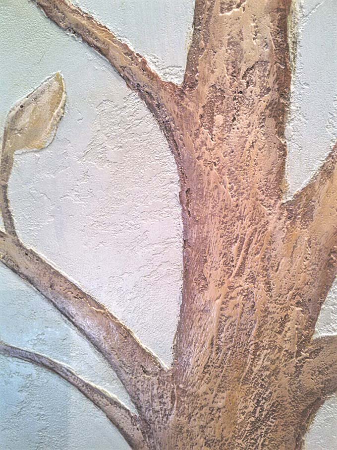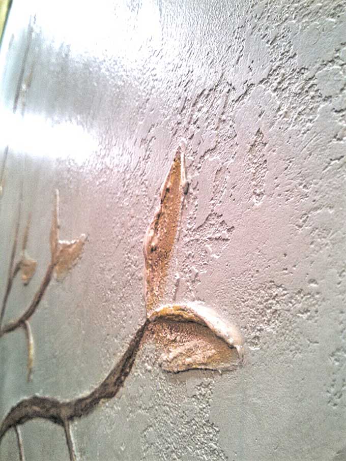 Объемная фактура из декоративной штукатурки. Цвет подбирался под паркет дуба и столешницы мебели.