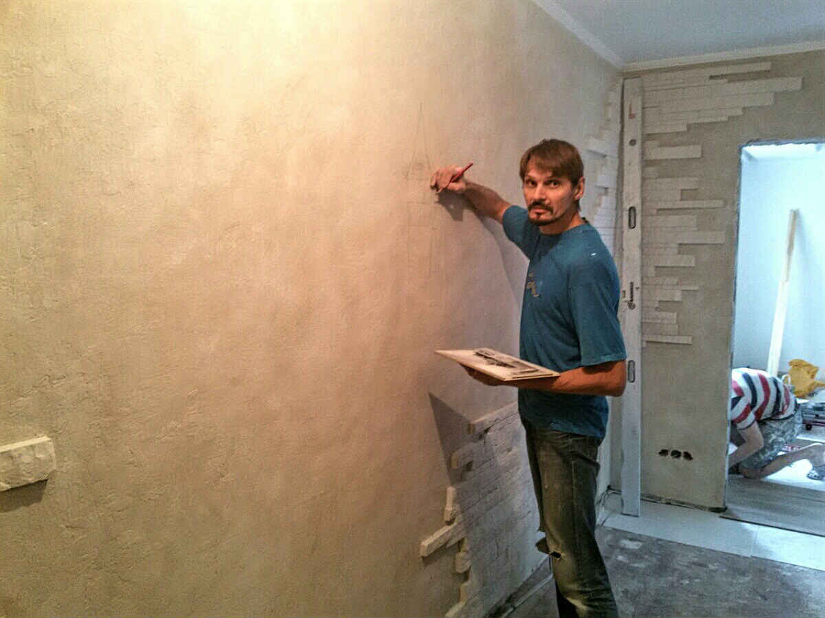 Сделано всё вручную, начиная от подготовки стены (декоративная штукатурка, травертин).