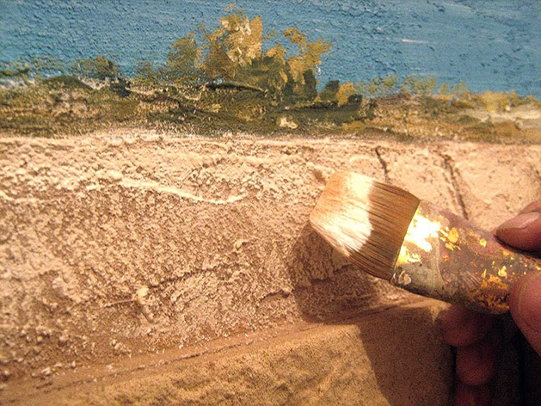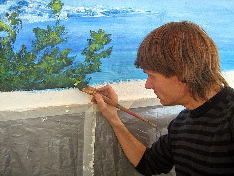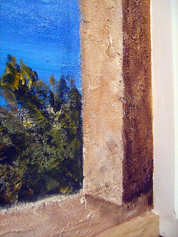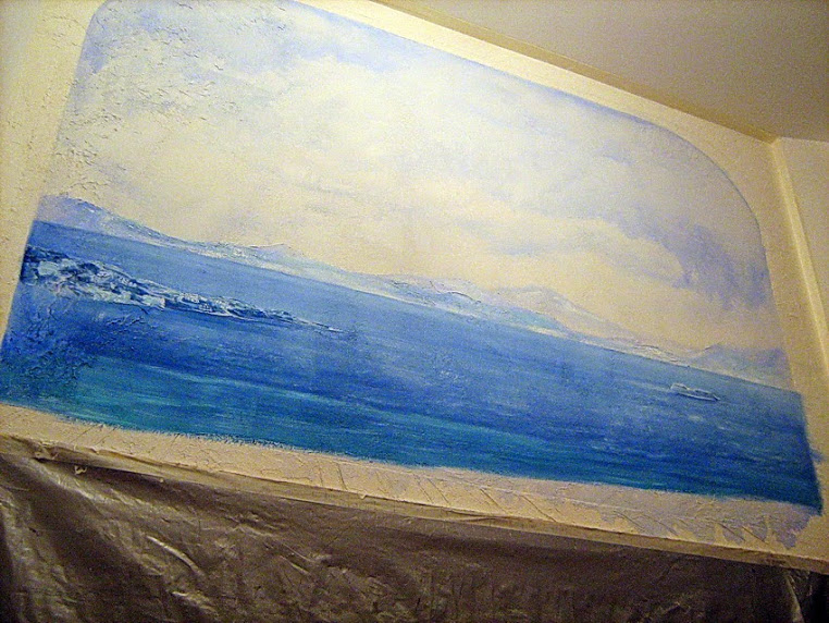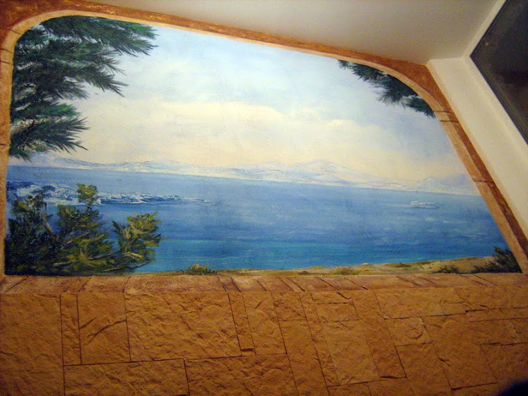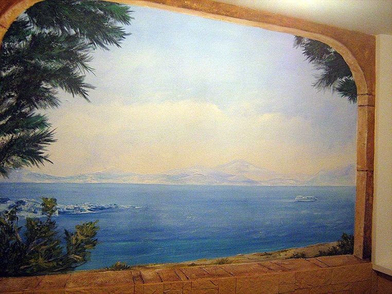 Греция.2,5х1,5 м. Из пяти предоставленных заказчиком фотографий была создана одна композиция. Учитывалися цвет арки, подоконник и плитка.